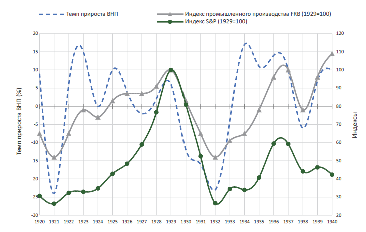 Рисунок 1. Рост ВНП, индекс промышленного производства и индекс S&P в 1920–1940 годы