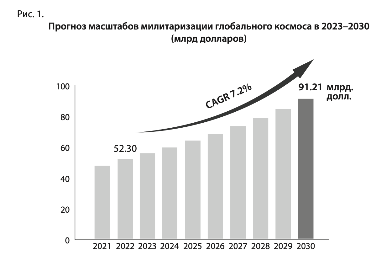 В-третьих, важным показателем является рост финансирования военного космоса. В 2023 г. в этой сфере произошёл заметный сдвиг: впервые в мировых правительственных ассигнованиях на КД (117 млрд долларов) оборонная часть (59 млрд долларов) превысила гражданскую[53]. Структурно финансирование военно-космической деятельности в 2023 г. выглядит так: США – 38,9 млрд долларов, Китай – 8,8 млрд долларов, Россия – 2,6 млрд долларов, Франция – 1,3 млрд долларов, Япония, Великобритания, Евросоюз и Германия – более 500 млн долларов каждая. По данным SNS INSIDER. Market size, к 2030 г. финансирование мировой военно-космической деятельности превысит 91 млрд долларов (рис. 1).