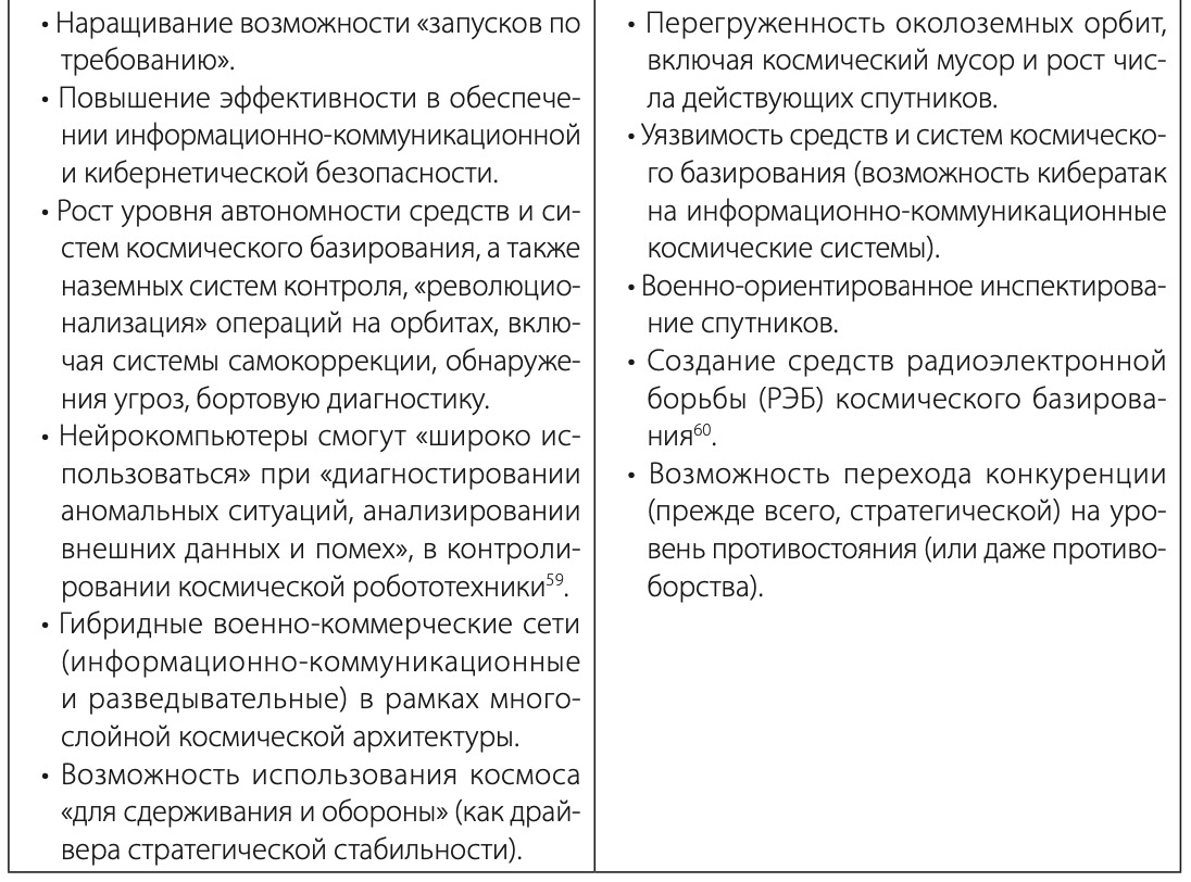 В целом отмеченные выше тренды – важнейшие показатели и необходимые исходные данные для долгосрочного планирования и прогнозирования КД. Сегодня космическая деятельность не только растёт и расширяется, но и находится в состоянии глубоких трансформационных процессов при заметном укреплении взаимосвязи вопросов экономики и проблем безопасности.