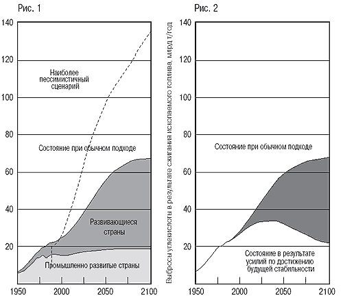 Едва ли не любой разумный анализ усилий, необходимых для стабилизации содержания двуокиси углерода, дает в результате «горбатую» кривую, подобную «Состоянию в результате усилий по достижению будущей стабильности» на рис. 2. Иными словами, долговременная цель (500–550 ppm) достижима, даже если в краткосрочной перспективе уровни выбросов продолжают расти. Затем, правда, обязательно должно начаться их снижение, иначе успеха не добиться (с определенного момента необходимо последовательное снижение выбросов, потому что ранее попавшая в атмосферу углекислота сохраняется в ней в течение столетий). Из графика на рис. 2, следует, что у нас еще есть время, чтобы осуществить целенаправленные меры. Но если мы хотим в будущем избежать необходимости принимать суровые и пагубные для экономики решения, то приступать к действиям надо как можно раньше.